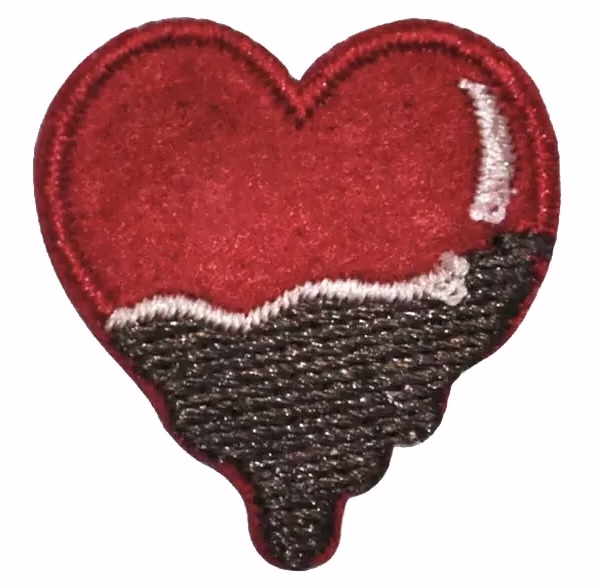 Unique chocolate-melt style embroidered red heart patch featuring a dripping design for a bold and playful look. Perfect for jackets, bags, and so much more! Please note: this patch does not include an iron-on backing. Fabric adhesive or sewing is required for application.