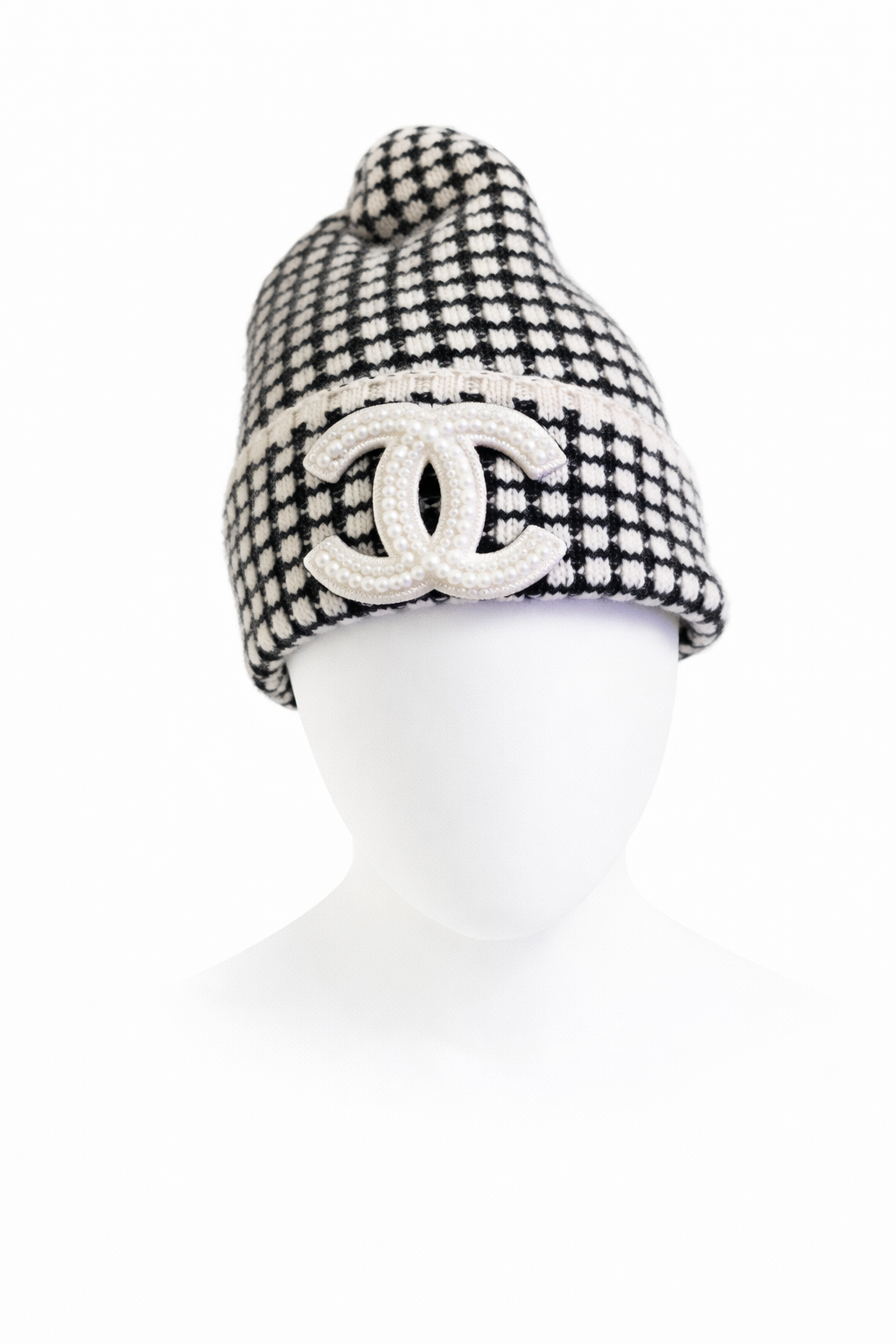 Chic houndstooth knit beanie with pearl-style emblem. Soft, warm, and designer-inspired—perfect for elevating winter outfits.