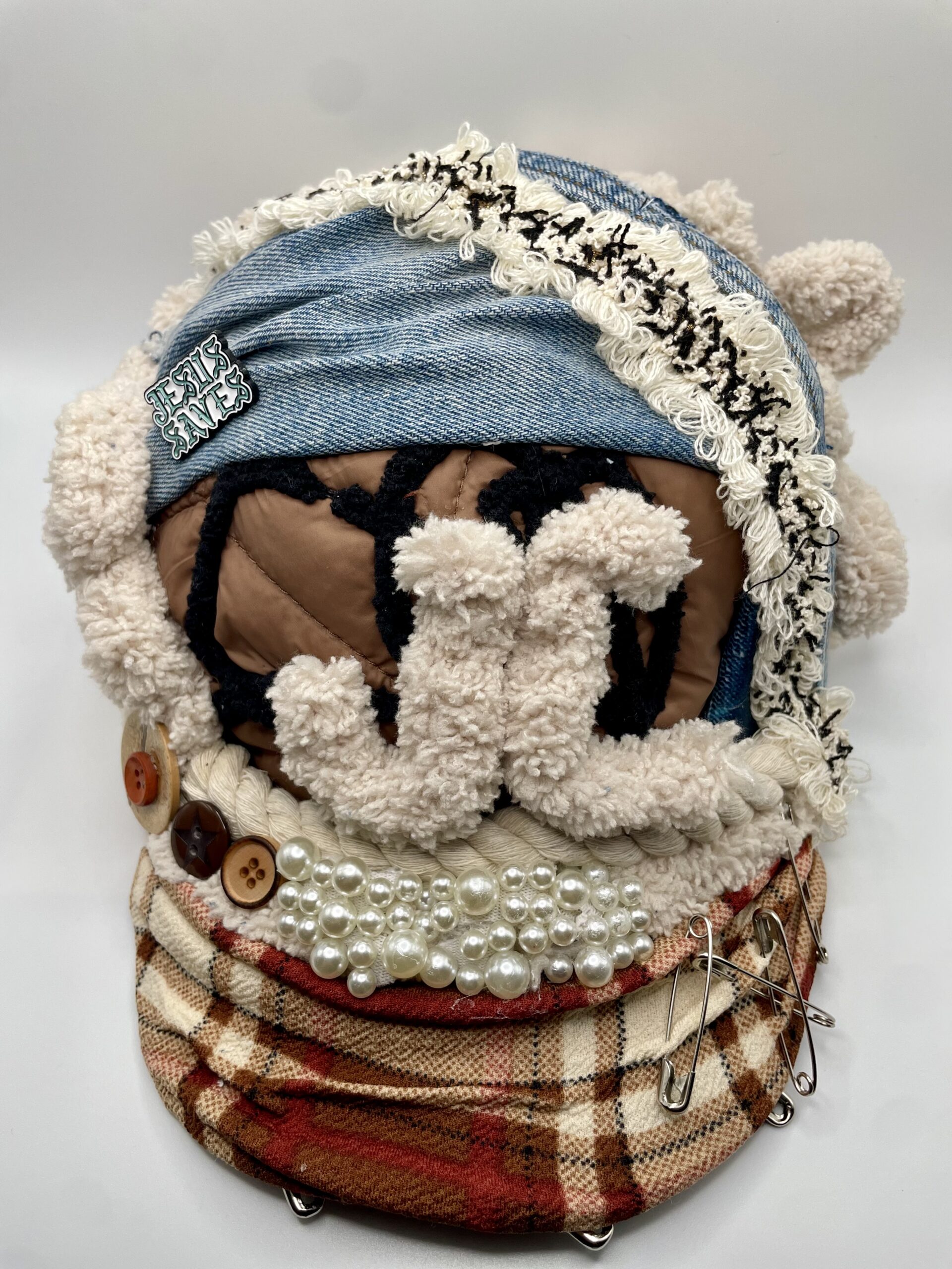 Luxury patchwork beanie with pearls, denim layers, and “Jesus Saves” detail. One size fits most (adult).
