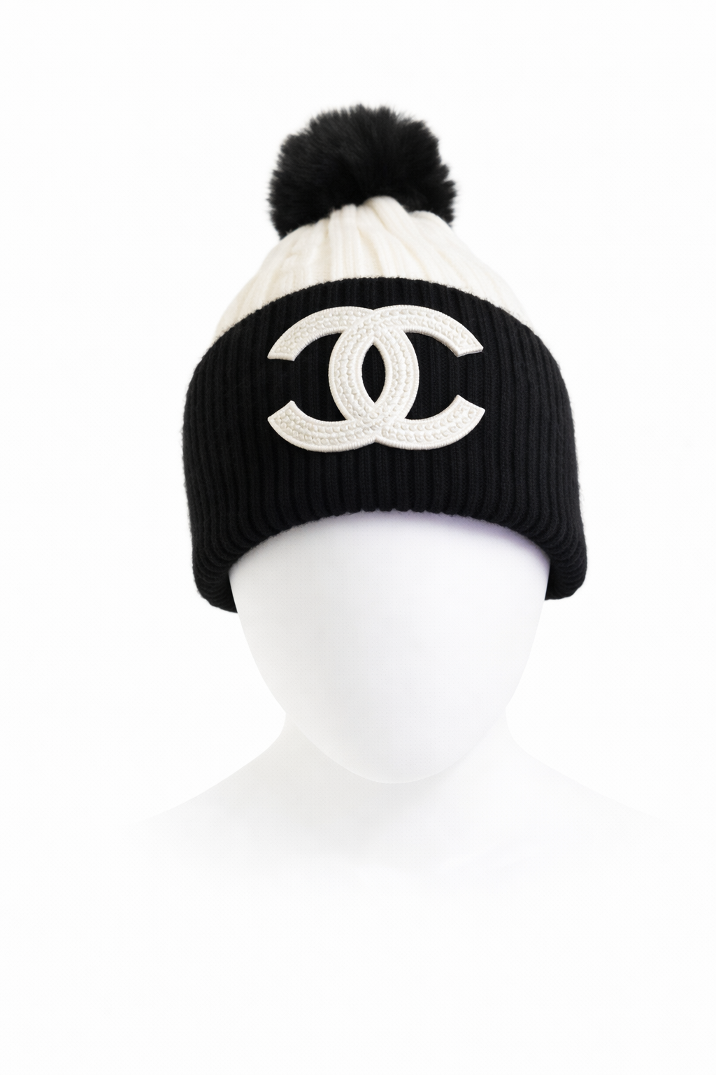 Stay warm in elevated style with this luxury-inspired knit pom beanie. Designed with a bold black and cream color-block look, soft ribbed knit texture, and a statement embroidered designer-style emblem, this beanie delivers a polished winter aesthetic with everyday comfort. Finished with a plush pom-pom and fold-over cuff for a snug, flattering fit.