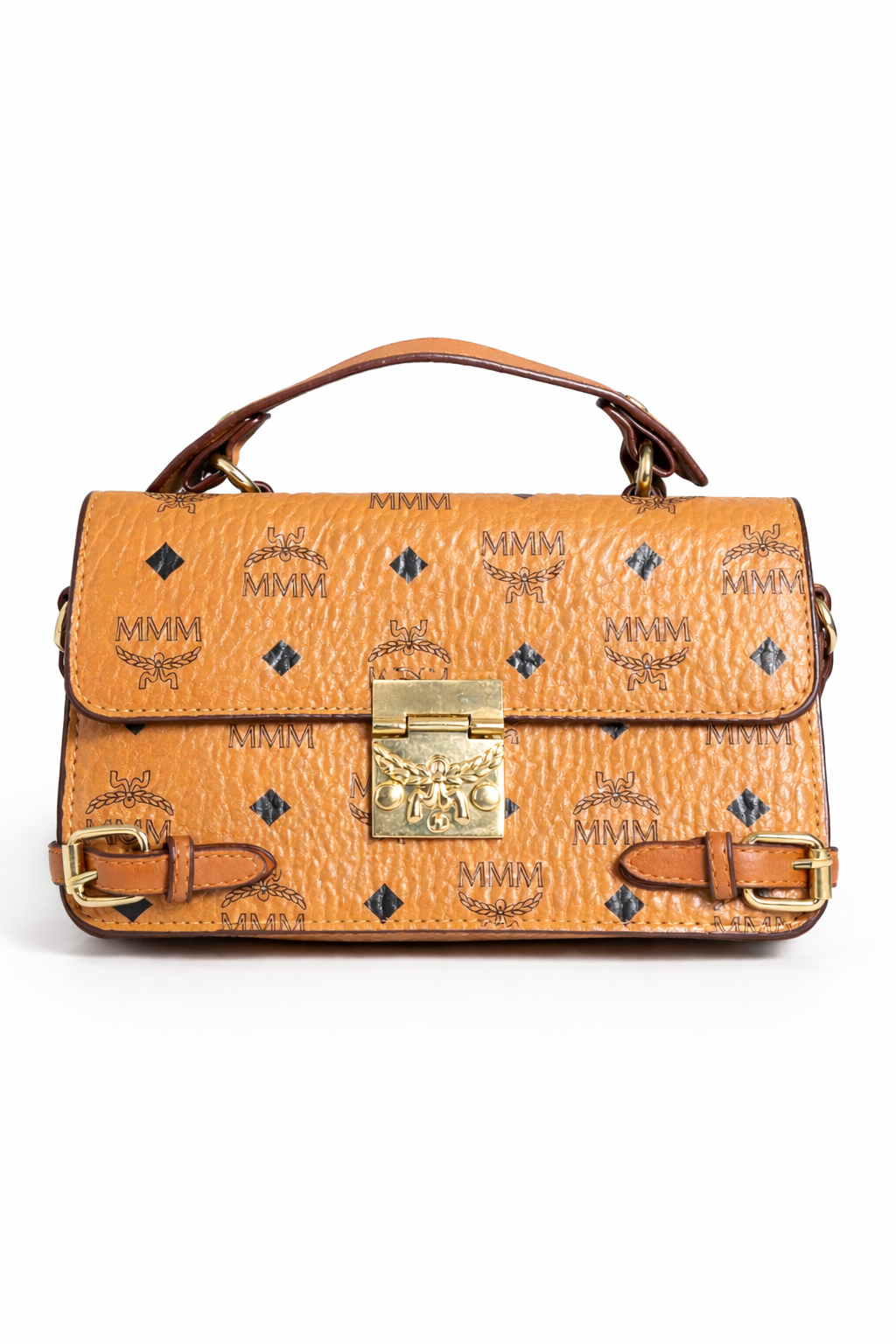 Chic MCM inspired mini top handle crossbody bag featuring textured brown leather-look material, gold-tone lock closure, and adjustable strap. Perfect for everyday wear or special outings.