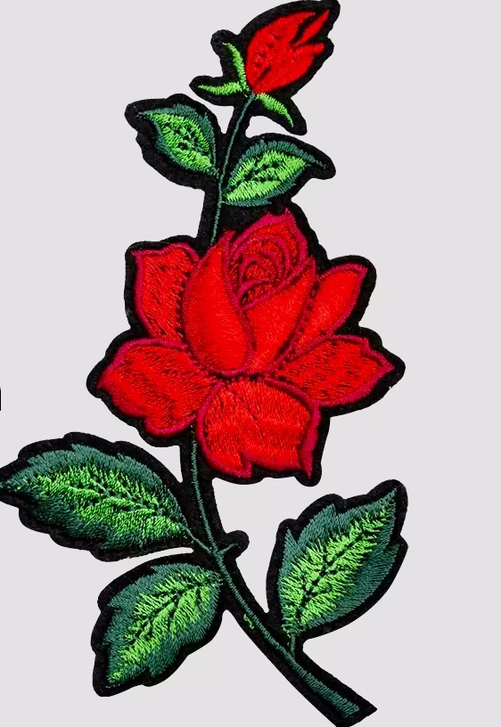 Rose flower embroidered patch with detailed stitching, ideal for decorating clothing and accessories.