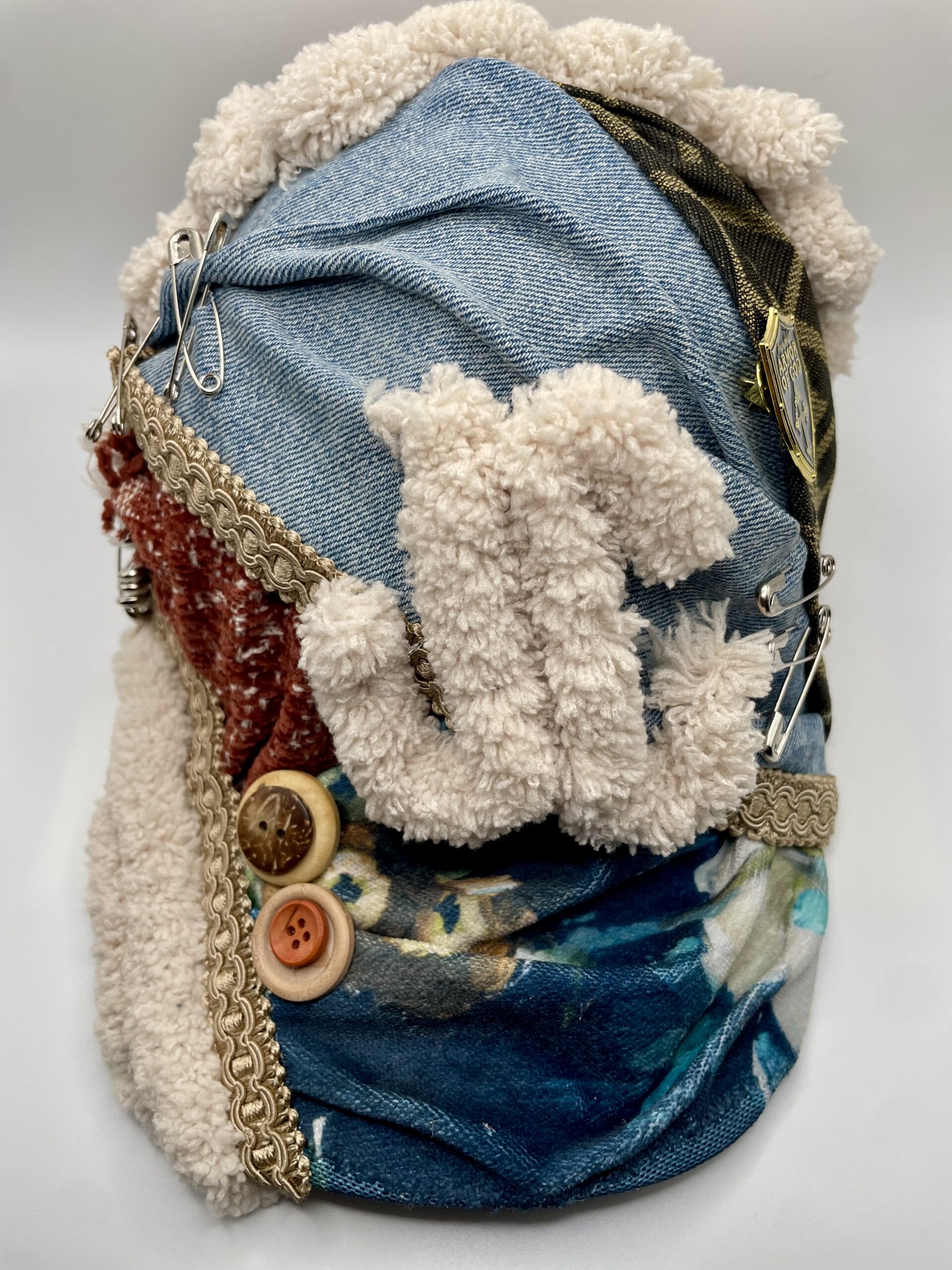 Hand-crafted, one-of-a-kind commissioner hat designed with mixed fabrics, safety pin detailing, textured trims, and symbolic accents. This piece represents faith, resilience, and kingdom authority. No hats are exactly alike.